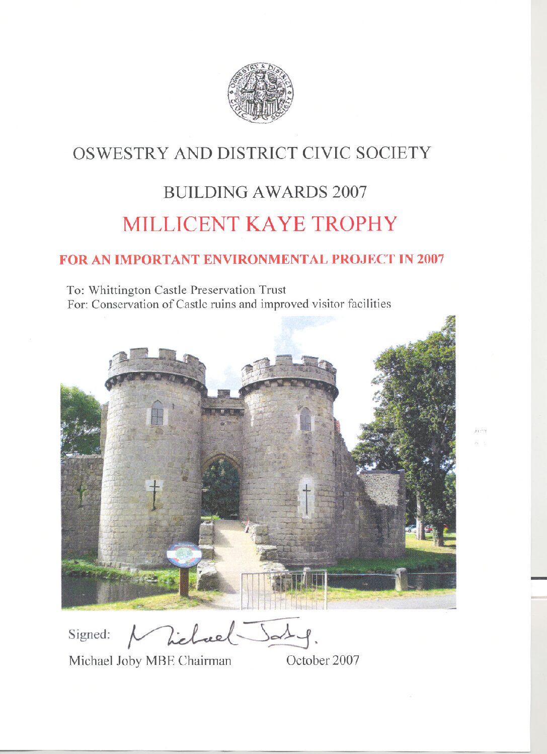The works received the Millicent Kaye Trophy awarded by Oswestry and Civic Society for The Conservation of Castle ruins and improved visitor facilities.